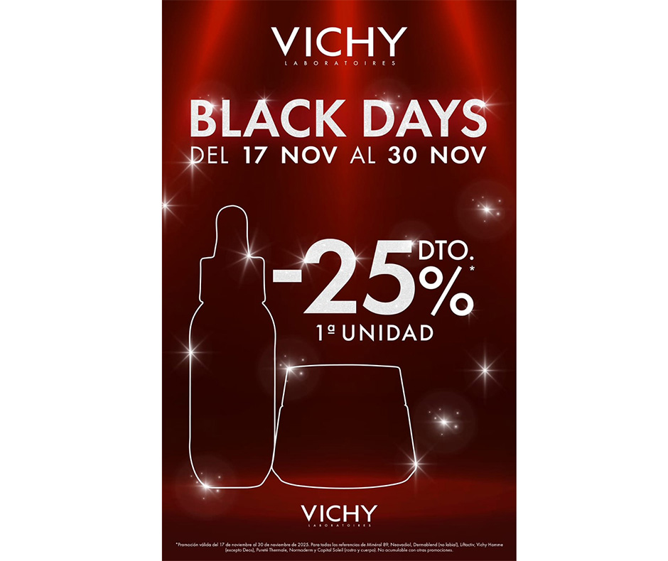 Promoción válida del 17 de noviembre al 30 de noviembre de 2025. Para todas las referencias de Minéral 89, Neovadiol, Dermablend (no labial), Liftactiv, Vichy Homme (excepto Deos), Pureté Thermale, Normaderm y Capital Soleil (rostro y cuerpo). No acumulable con otras promociones.